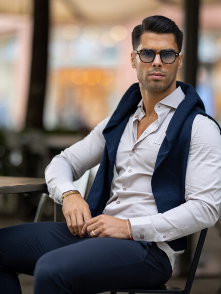 Camisa clássica de gola redonda. Com corte slim fit para um ajuste perfeito. Fabricada em algodão. Fecho mediante botão de fixação à frente. Manga terminada em punho abotoado arredondado. Cuidadosamente desenhadas e fabricadas em Portugal, as peças ELEGANT destinam-se a todos os que queiram estar sempre no seu melhor.