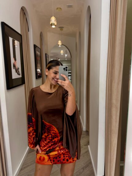 VESTIDO CASTANHO COM CINTO E SAIA PLISSADA IMPERIAL