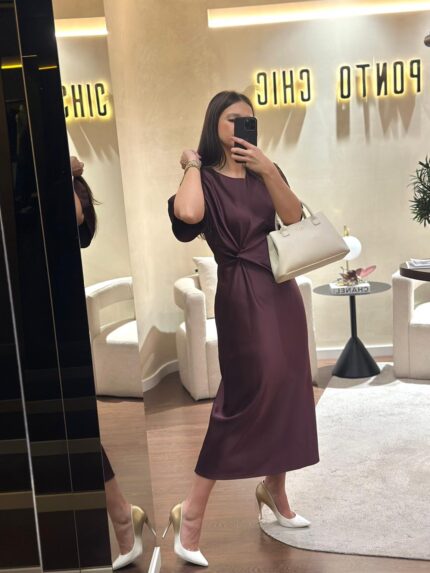 VESTIDO BORDÔ COM CORTE JUSTO E CORDÃO FRONTAL RINASCIMENTO