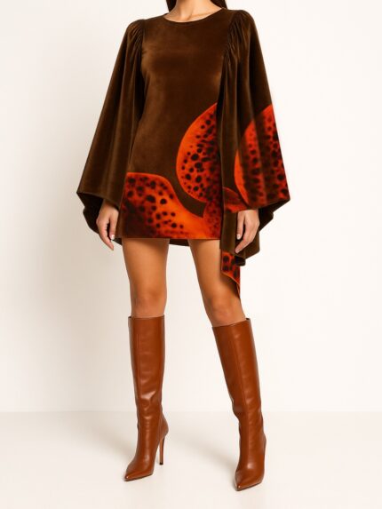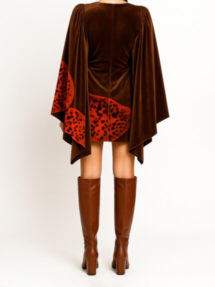 VESTIDO VELUDO CASTANHO COM ESTAMPA ARTÍSTICA SAHOCO