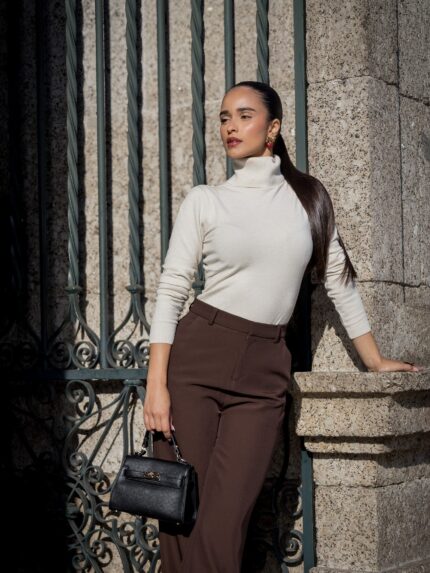 O contraste de cores em preto e cru dá-lhe um visual contemporâneo e elegante, enquanto a gola alta acrescenta um toque de aconchego e estilo refinado.