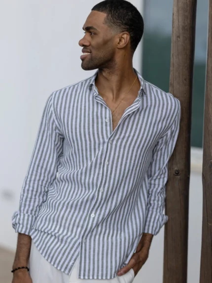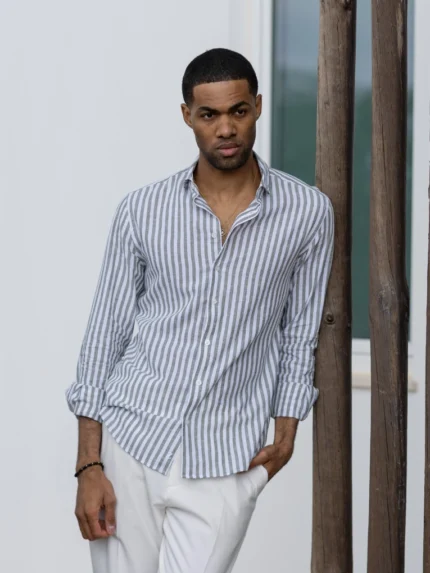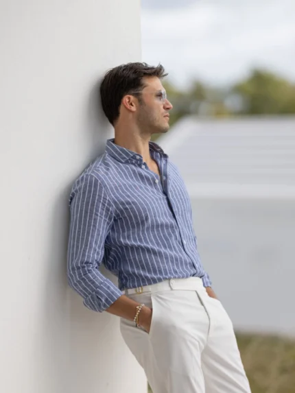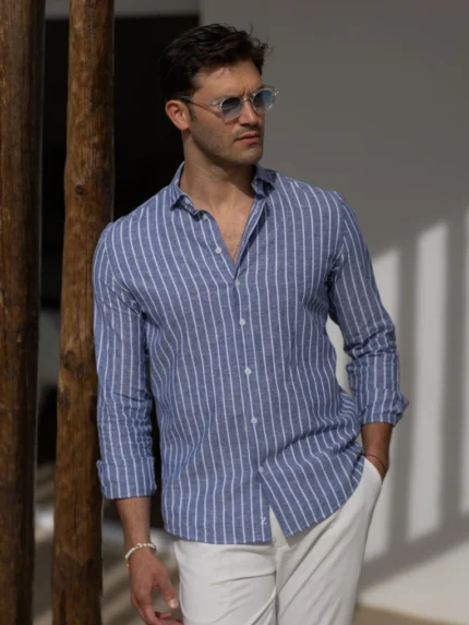 CAMISA GOLA ITALIANA DE LINHO COM RISCA AZUL CLARO ZOLF