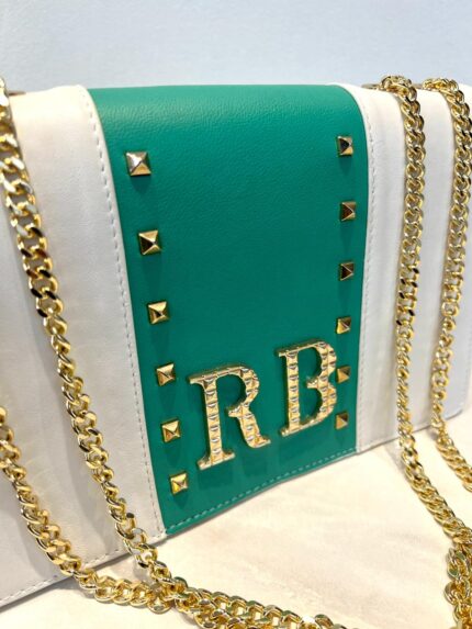 €25.00MALA BRANCA E VERDE COM TACHAS E CORRENTE DOURADA ROBERTA BIAGGI