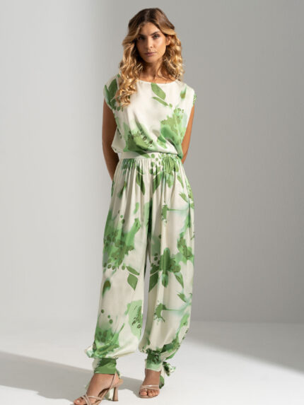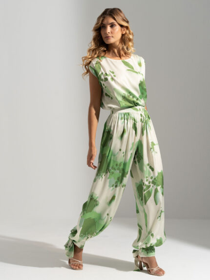 CALÇA VERDE ESTAMPADA FLUIDA COM DETALHE DE ATAR FERRACHE