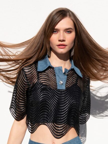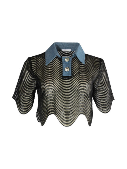 TOP CROPPED EM REDE PRETA GOLA EM DENIM SAHOCO