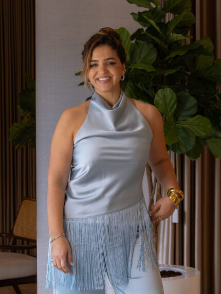 TOP AZUL COM DECOTE DRAPEADO E FRANJAS IMPERIAL
