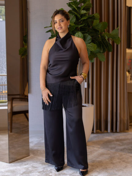 TOP PRETO COM DECOTE DRAPEADO E FRANJAS IMPERIAL