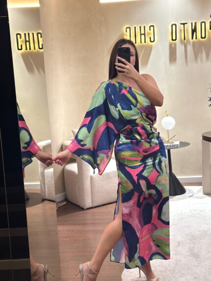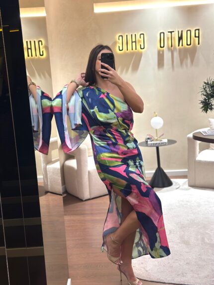 €129.90VESTIDO ESTAMPADO MANGA UNILATERAL PONTO CHIC