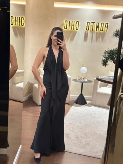 VESTIDO LONGO ACETINADO PRETO COM FOLHO ELEH