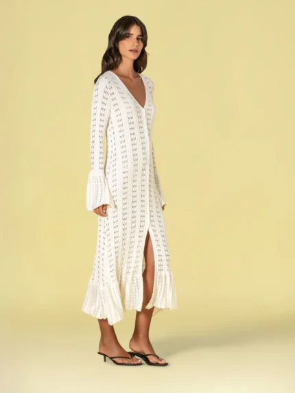 VESTIDO BEGE DE MALHA RENDADA COM BOTÕES RUGA
