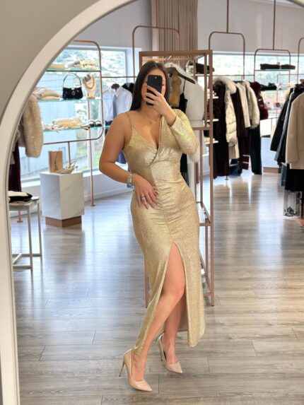 VESTIDO DOURADO COM BRILHO E DRAPEADO RINASCIMENTO
