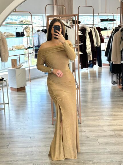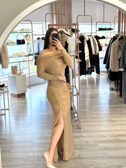VESTIDO COMPRIDO DOURADO DE MALHA METÁLICA RINASCIMENTO