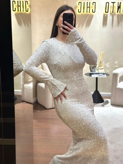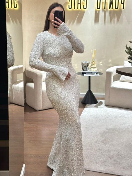 VESTIDO LONGO DE LANTEJOULAS CHAMPAGNE PONTO CHIC