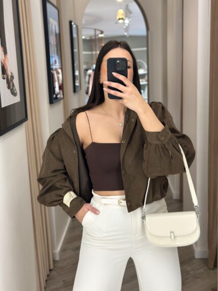 CASACO CURTO CASTANHO EM CAMURÇA SINTÉTICA PONTO CHIC