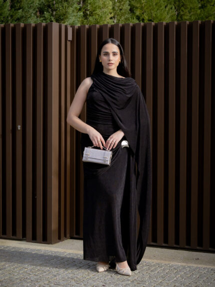 VESTIDO COMPRIDO CASTANHO DRAPEADO COM RENDA PONTO CHIC