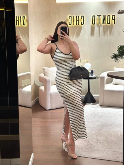 VESTIDO BRANCO E PRETO TEXTURADO COM PADRÃO ÀS RISCA PONTO CHIC