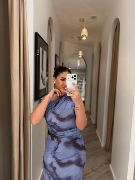 VESTIDO MIDI ESTAMPADO COM DRAPEADO PONTO CHIC