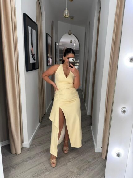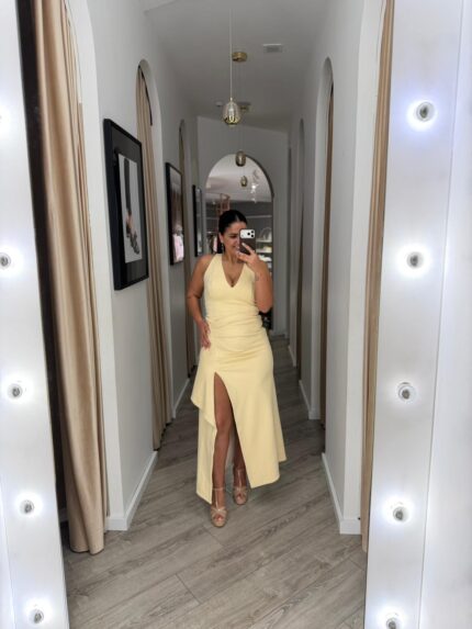 VESTIDO ROSA E CAMEL ACETINADO COM DETALHE DOURADO LANÇA PERFUME