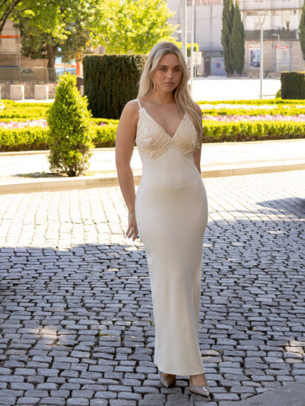 VESTIDO CRU COM ARGOLAS DECORATIVAS NAS COSTAS LANÇA PERFUME