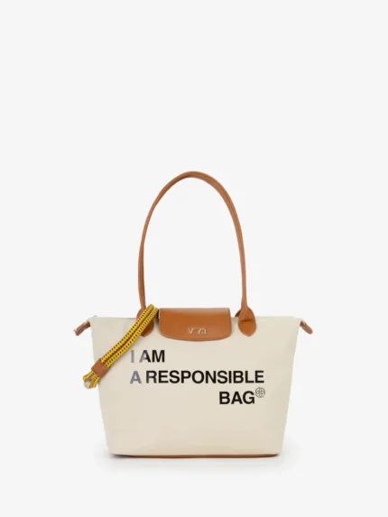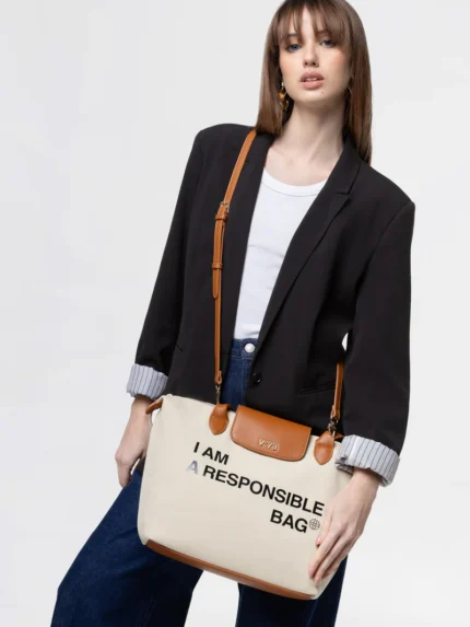 BOLSA BEGE COM MENSAGEM E DETALHES EM PELE CAMEL PONTO CHIC