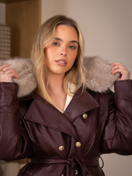 TRENCH COAT EM ECOPELE CASTANHO PONTO CHIC