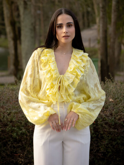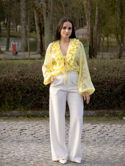 BLUSA AMARELA COM FOLHOS E MANGA FLUIDA PONTO CHIC