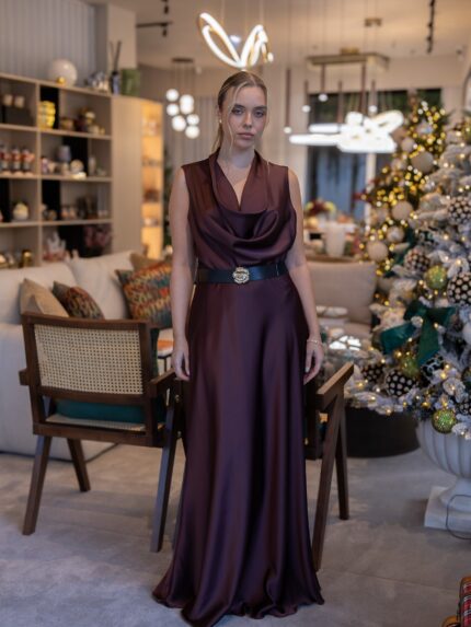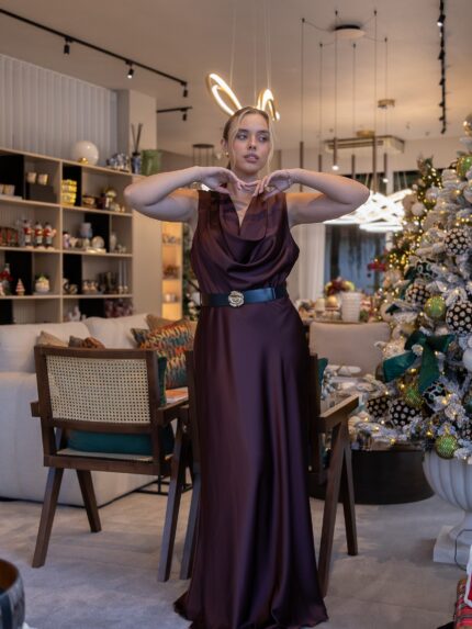 €172.90VESTIDO CASTANHO ACETINADO COM DECOTE DRAPEADO E CINTO RINASCIMENTO