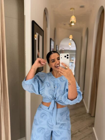 €67.50BLUSA AZUL FLUIDA COM BORDADO INGLÊS RUGA