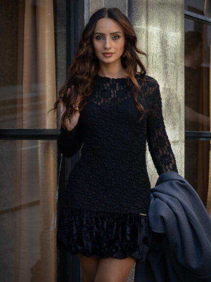 VESTIDO CURTO EM RENDA COM FOLHO EM VELUDO SAHOCO