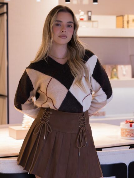 CAMISOLA TRICOT GEOMÉTRICA CASTANHO E CRU PONTO CHIC