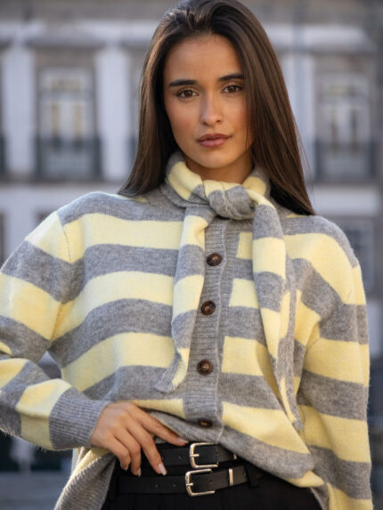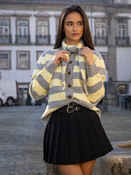 CASACO DE MALHA ÀS RISCAS CINZA E AMARELO COM BOTÕES PONTO CHIC
