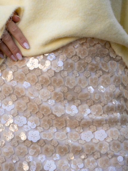 SAIA BEGE COM APLICAÇÃO DE LANTEJOULAS FLORAIS PONTO CHIC