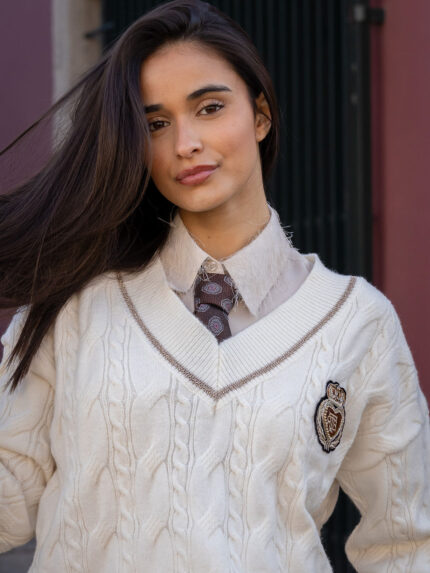 CAMISOLA DE MALHA CRU COM DECOTE EM V E DETALHE BRILHANTE PONTO CHIC