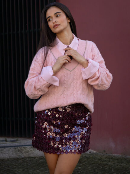 CAMISOLA DE MALHA ROSA COM DECOTE EM V E DETALHE BRILHANTE PONTO CHIC