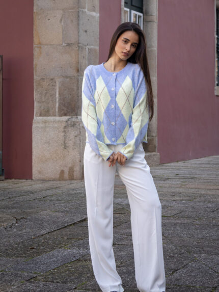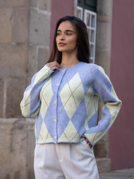 CASACO DE MALHA AZUL BEBÉ COM PADRÃO DE LOSANGOS PONTO CHIC