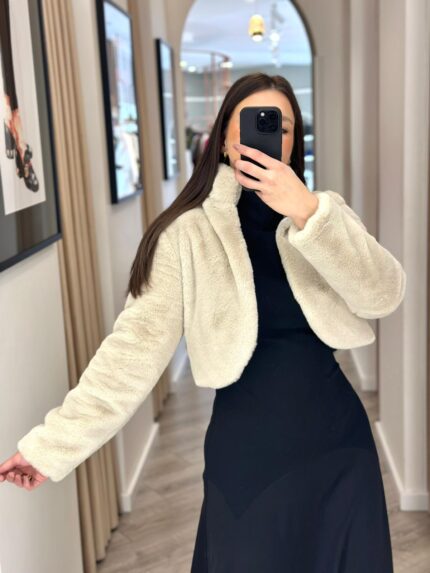 CASACO CURTO EM PÊLO COM APLICAÇÃO JOIA BEGE PONTO CHIC