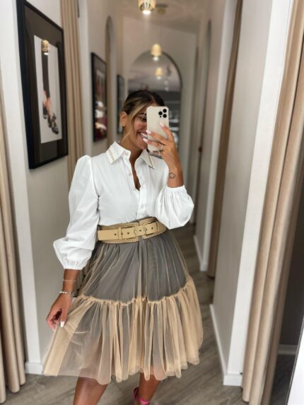 SAIA MIDI DE TULE EM CAMADAS BEGE RENASCIMENTO
