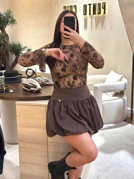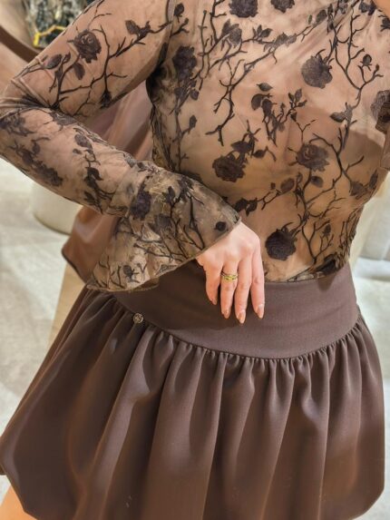BLUSA CASTANHA COM FLORES PONTO CHIC