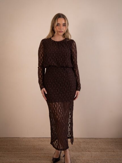 VESTIDO COMPRIDO DE RENDA CASTANHO PONTO CHIC