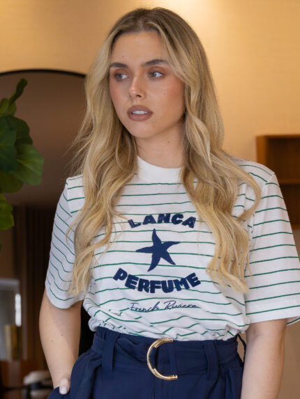 €128.00T-SHIRT BRANCA RISCADA A VERDE COM ESTAMPADO LANÇA PERFUME