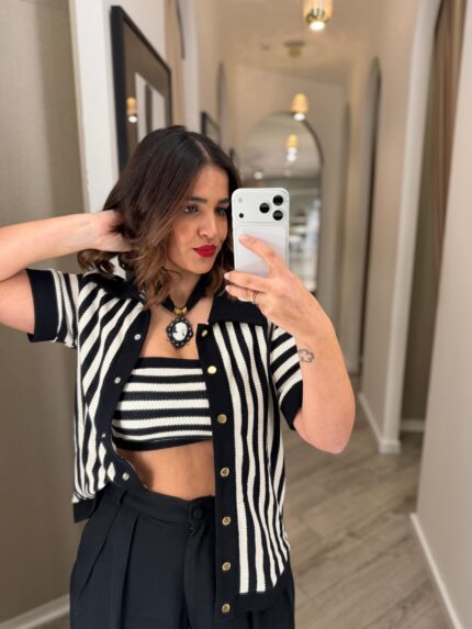 €88.00CARDIGAN MALHA ÀS RISCAS PRETO E BRANCO LANÇA PERFUME