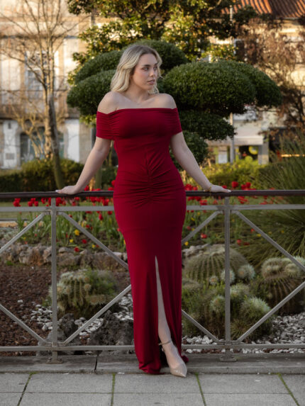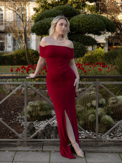 VESTIDO VERMELHO COM DRAPEADO CENTRAL E COSTAS ABERTAS PONTO CHIC