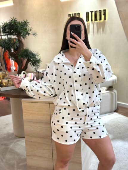 CONJUNTO BRANCO ÀS BOLINHAS COM AJUSTE NA CINTURA PONTO CHIC