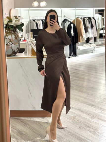 VESTIDO CASTANHO MIDI COM MANGA COMPRIDA RINASCIMENTO