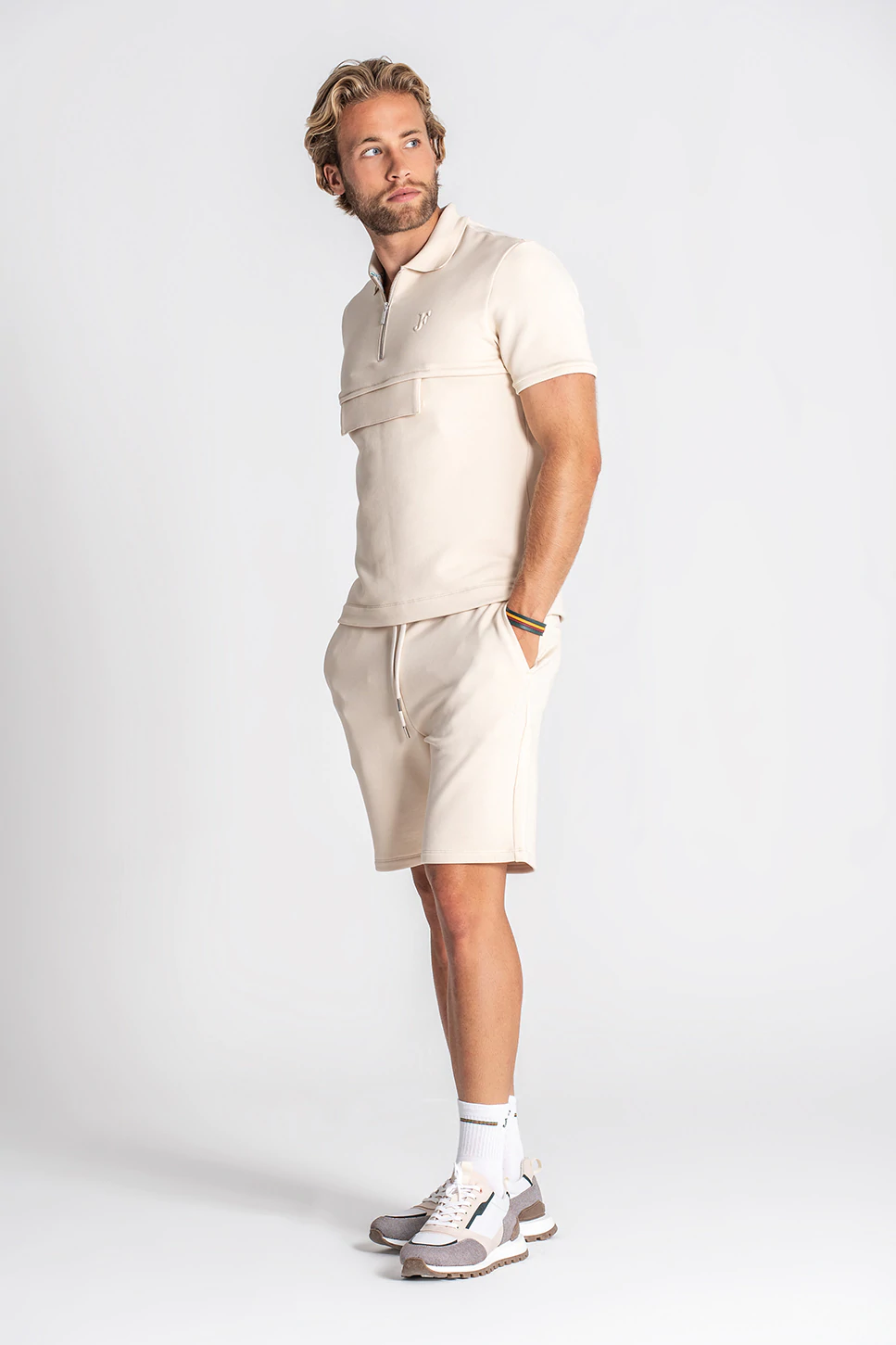 Anorak em tom bege, confecionado maioritariamente em algodão (90%), com poliamida e elastano, oferecendo conforto, respirabilidade e uma ligeira elasticidade para um ajuste mais natural.