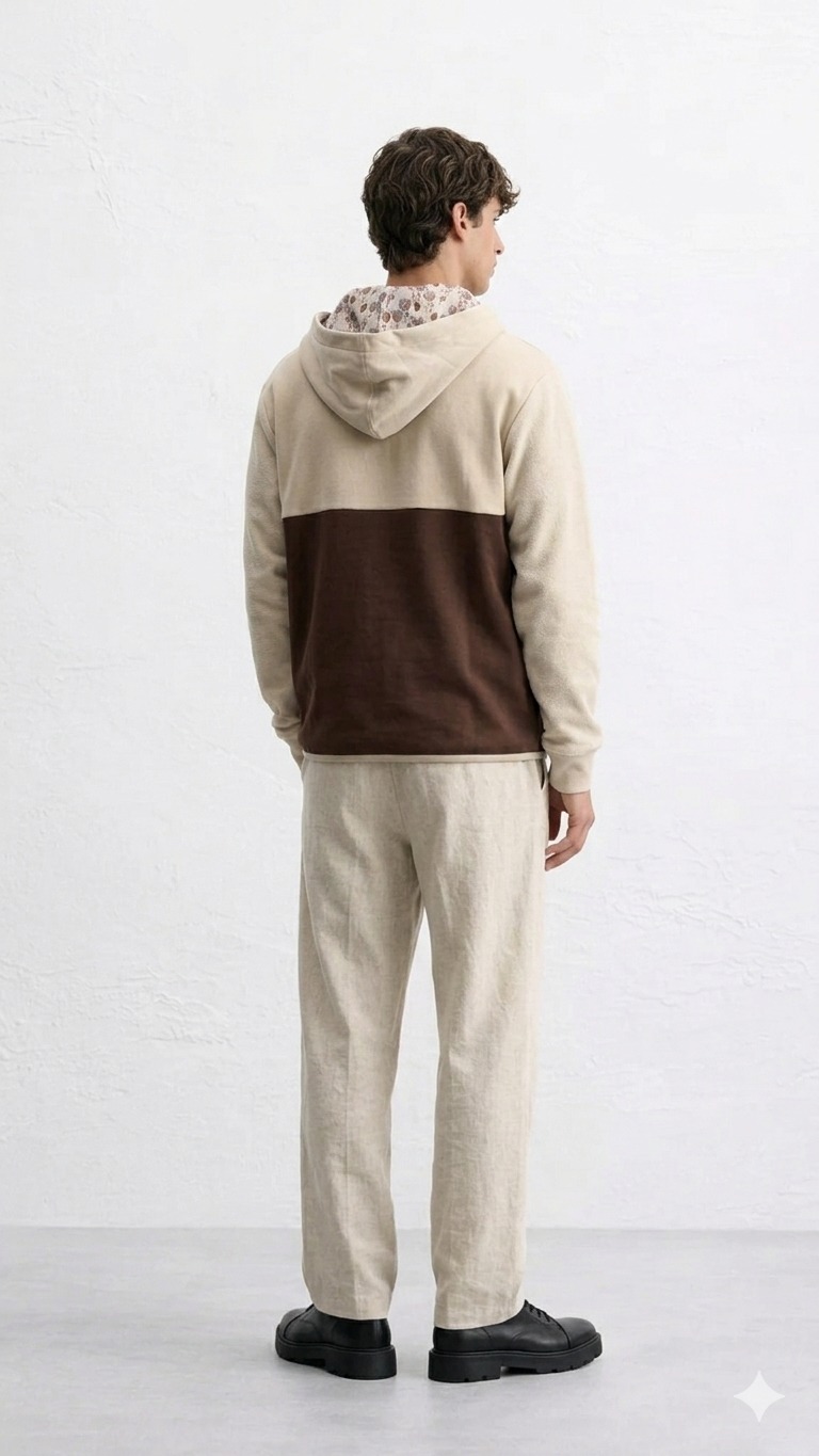 Anorak em combinação de tons bege e castanho, confecionado em algodão orgânico (100%) no corpo principal, garantindo conforto, respirabilidade e um toque premium. As mangas apresentam mistura de algodão e poliéster, oferecendo maior resistência e durabilidade.