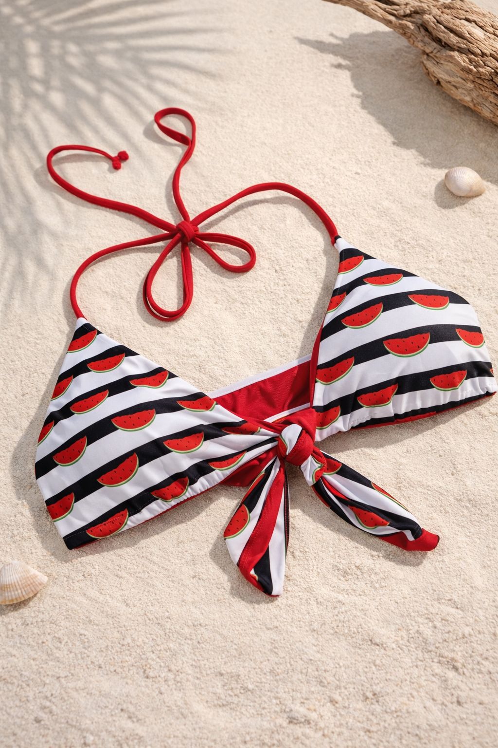 Este biquíni destaca-se pelo seu padrão irreverente de melancias sobre fundo às riscas, criando um contraste vibrante e cheio de personalidade. Confeccionado com 85% poliamida e 15% elastano, oferece conforto, elasticidade e um ajuste perfeito ao corpo, com forro em 100% poliamida para maior suavidade.