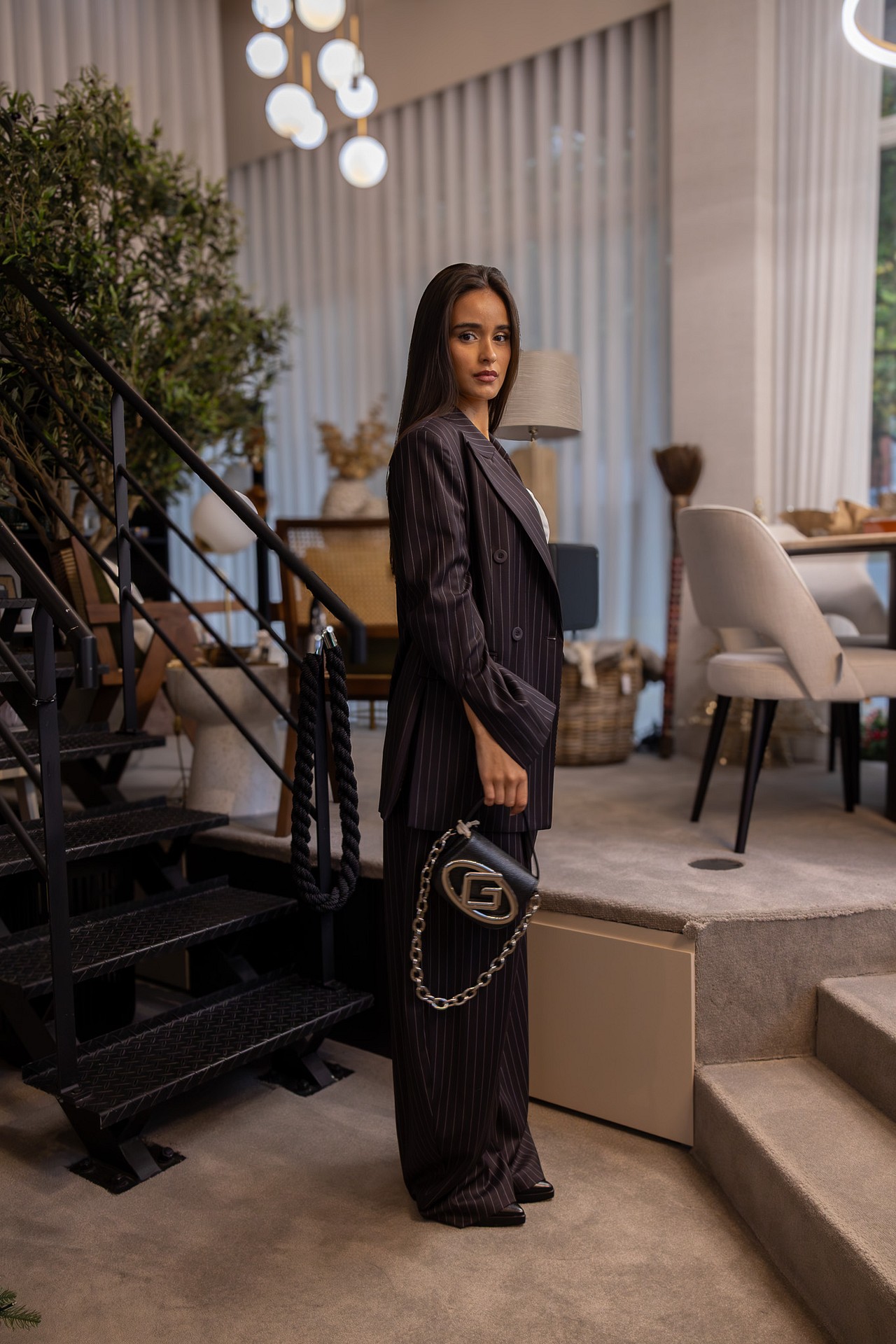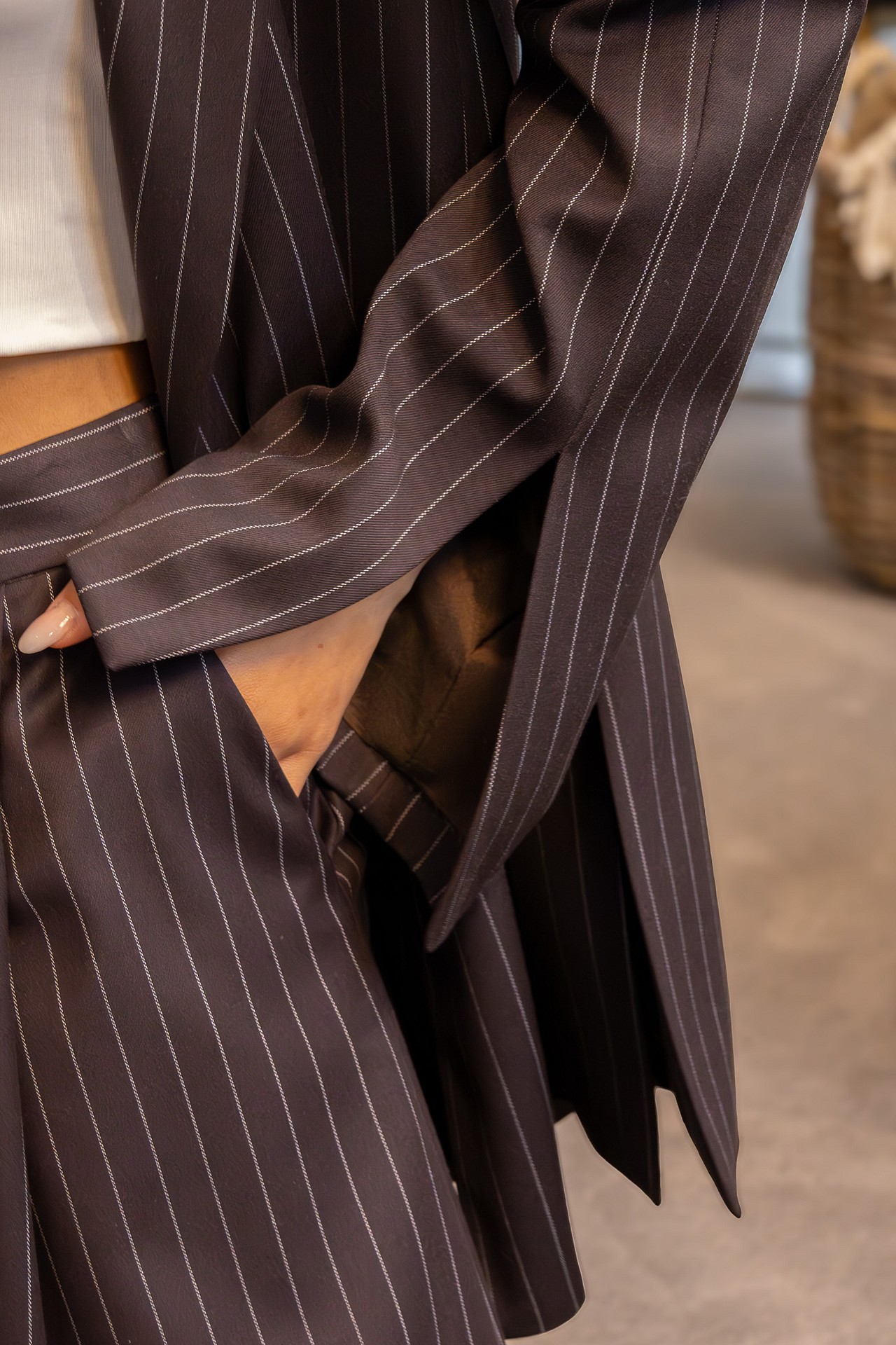 O blazer às riscas preto da marca Imperial é a definição de sofisticação intemporal. O tom preto profundo aliado às riscas finas verticais cria uma silhueta elegante e alongada, conferindo um visual refinado que nunca sai de moda.