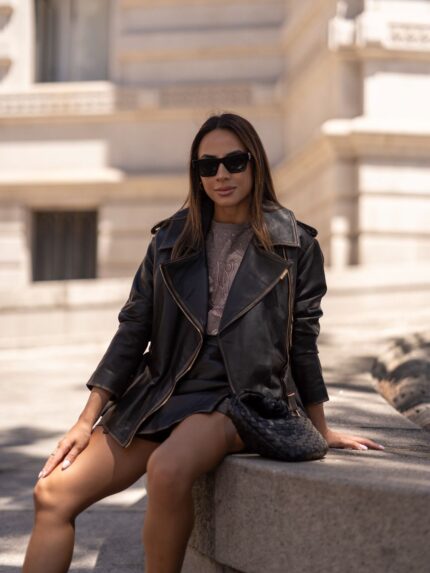 CASACO EM PELE CASTANHO COM CINTO E FECHOS METÁLICOS SAHOCO