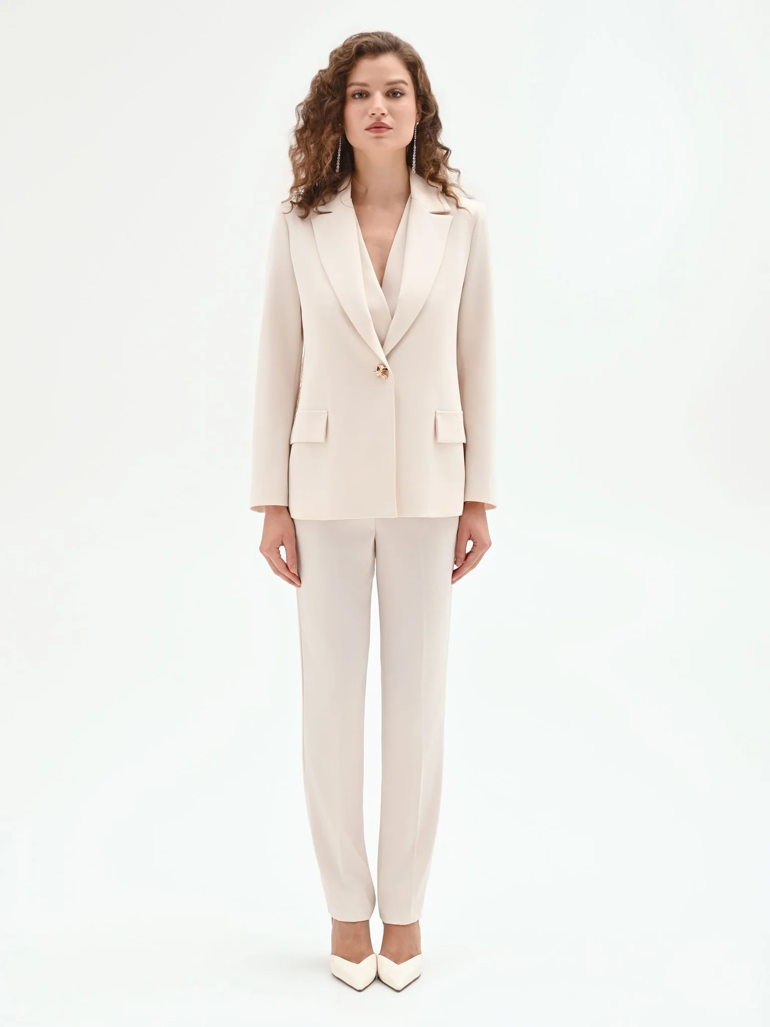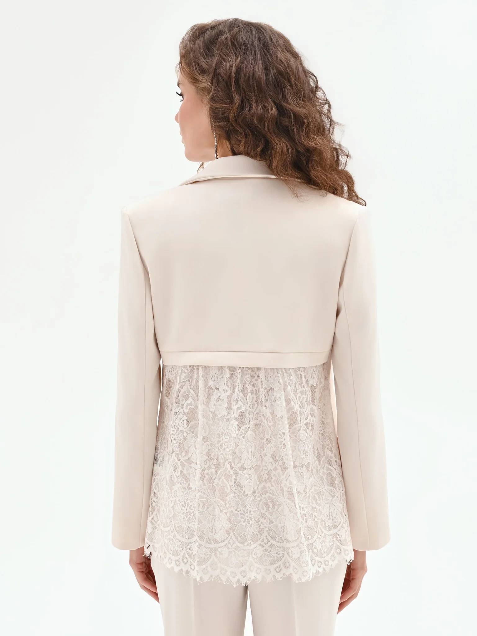 O grande destaque surge nas costas, com aplicação de renda que acrescenta textura, leveza e um contraste subtil entre alfaiataria e romantismo. Um detalhe inesperado que transforma uma peça clássica numa proposta diferenciadora e moderna.